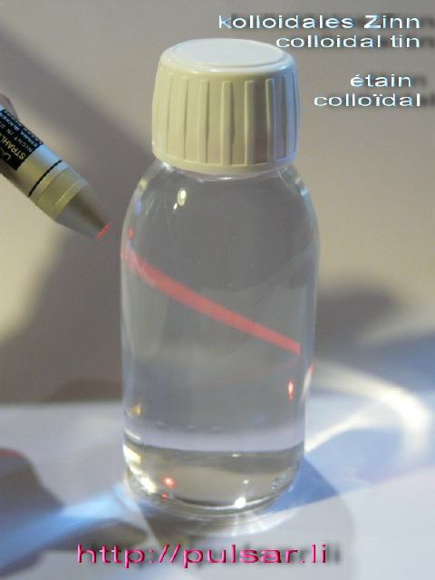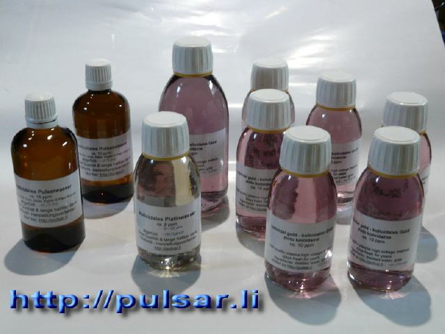Nous utilisons une tension élevée (plusieurs milliers de volts, c.a.d. 10'000v) et un courant électrique alternatif avec un arc électrique produit sous l’eau, pour la production des colloïdes. Avec cette méthode, même les métaux comme l'or, qui sont résistants à l’électrolyse sont pulvérisés à l’aide de l’arc électrique. Cela permet d’obtenir de l’or colloïdal d’une couleur entre l’indigo et le rose pâle.