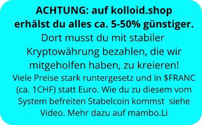 Ich aktzeptiere nebst € und CHF auch folgende Kryptowährungen als Zahlungmittel: - KAS, Kaspa - FRANC Solidcoin (ca. 1 CHF) Dieser Solidcoins wurde von Mambo.li kreiiert. -XMR Monero - TON, Toncoin (von telegram) ....... Mehr Infos siehe Rubrik Cryptos. |