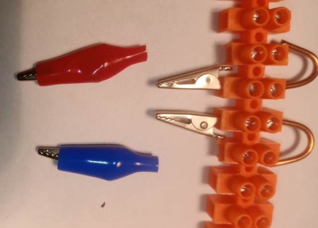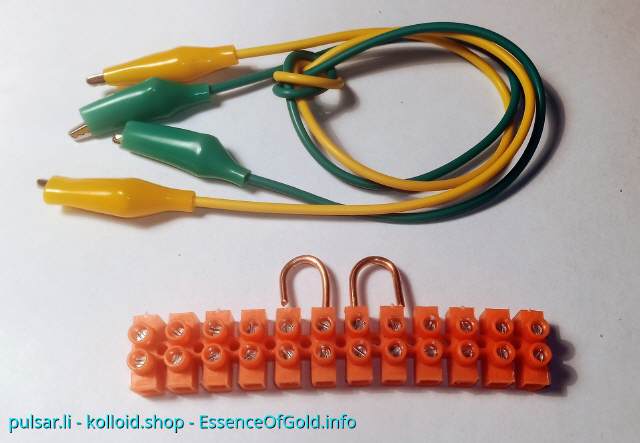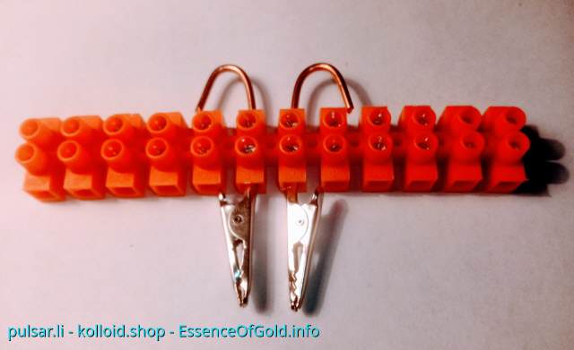 Lüsterklemmenreihe mit Krokodilzangen als Halterung für Goldelektroden, Goldplättchen