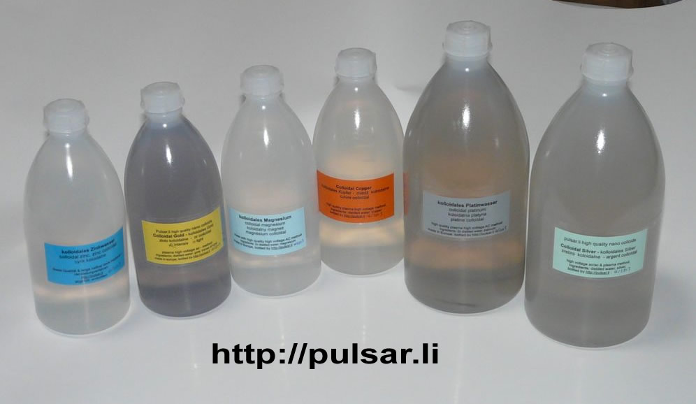 Achtung: Unsere kolloiden Pulsar-Wasser haben wegen ihrer feinen Nanogrösse dank Hochvolt - Wechselstromverfahren HVAC bzw. Hochvolt-AC - Plasmaverfahren theoretisch eine 50 bis x100 fach grössere Bio-Effizienz (Wirkung) bei gleicher Konzentration (ppm) im Vergleich zu Kolloiden, die mit Niedervoltgeräten (ACDC) selbst hergestellt werden können! Dies bezieht sich insbesondere auf den nicht ionischen Anteil der Kolloide.