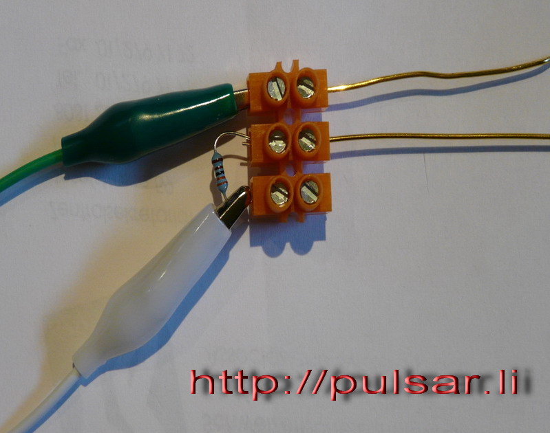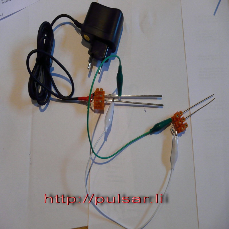 Anwendung: Je eine Krokodileklemme an je eine Silberelektrode Klemmen. Darauf achten, dass weder die beiden Silberelekroden noch die beiden Klemmen einander berühren. Auf der anderen Seite Klemmen and Schraubenhalter hängen; beim Widerstand darauf achten, dass die Klemme vor dem Widerstand angeklemmt wird, falls gewünscht ist, dass der Widerstand verwendet wird.