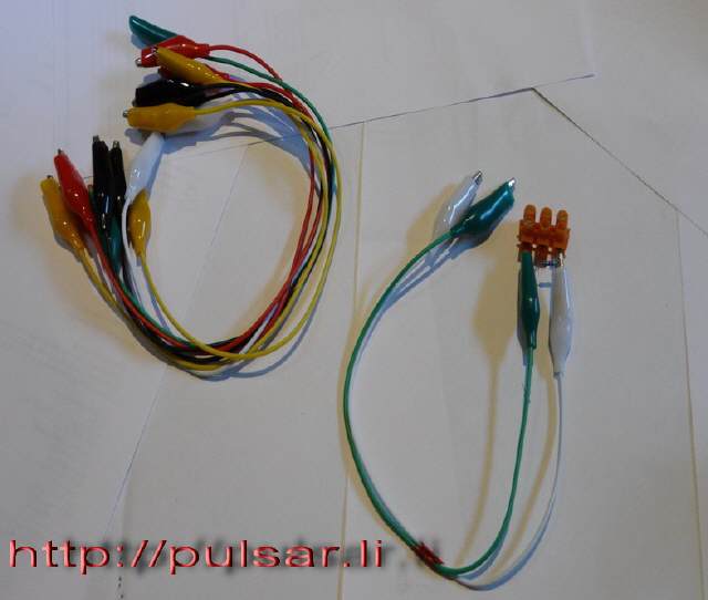 2 Kabel 28cm mit Krokodilklemmen an beiden Enden, 3er Schraubenklemme mit Widerstand 3.3 KOhm.