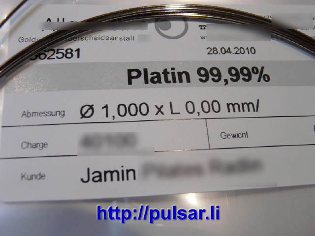 Zum Beispiel habe ich mit der Platinformel das Gewicht der Platinstäbe berechnet, bevor ich die Ware in den Händen hatte. Ich war natürlich dann gespannt, ob das Gewicht stimmen wird. Es hat genau gestummen, siehe Bilder unten. 1Paar 5cmx 1mm Ø Reinplatin musste nach der Platin- Formel [45 KB]
